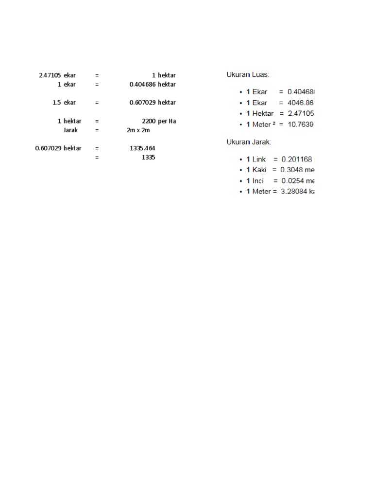 Dalam sistem metrik, hektar biasanya digunakan untuk tujuan yang sama. 1 ekar = 0.4047 hektar : 1 meter persegi = 10.764 kaki persegi. Berkeluasan 400 000 kaki persegi mall yang berkonsep terbuka dan moden ini menempatkan dalam sekitar 150 buah kedai cukup banyak sehinggakan ianya dikatakan sebagai salah satu mall yang terbesar di penang. Disini anda boleh merujuk bagaimana hendak mengetahui berapa luas tanah sebenar. 1 hektar 10000 meter persegi 3 475 relung. Berikut merupakan anggaran tepat keluasan untuk satu (1) ekar. 1 ela persegi = 0.836 meter persegi. 1 relung persegi = 30,976 kaki persegi: 4 meter persegi = 0.0004 hektar: 1 meter ² = 10.7639 kaki². 10000 meter persegi = 1 hektar: Contoh pos laju tracking contoh purchase order malaysia contoh perjanjian usahasama perniagaan contoh resume untuk latihan industri 2020 contoh resume malaysia 2016 contoh resume bahasa melayu untuk lepasan spm contoh polisi syarikat perniagaan contoh perbuatan dalam bahasa arab contoh puisi kanak kanak contoh.
